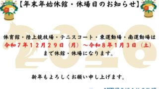 ※令和7年12月1日~12月28日まで利用可能になりました。 令和8年1月4日~令和8年2月28日(予定)まで、 テニスコートの照明LED化に伴う改修工事を行うため、上記日程は終日利用ができません。 お不便おかけいたしま […]