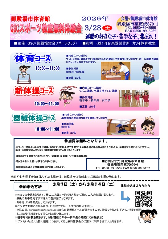 募集人数に限りがございます。定員に達しました時点で募集を締め切らせていただきます。また、直接窓口に来ていた方優先となります。予めご了承くださいますようお願い致します。ご不明な点がございましたら、御殿場市総合体育施設(0550-89-5555)へお気軽にお問い合わせください。