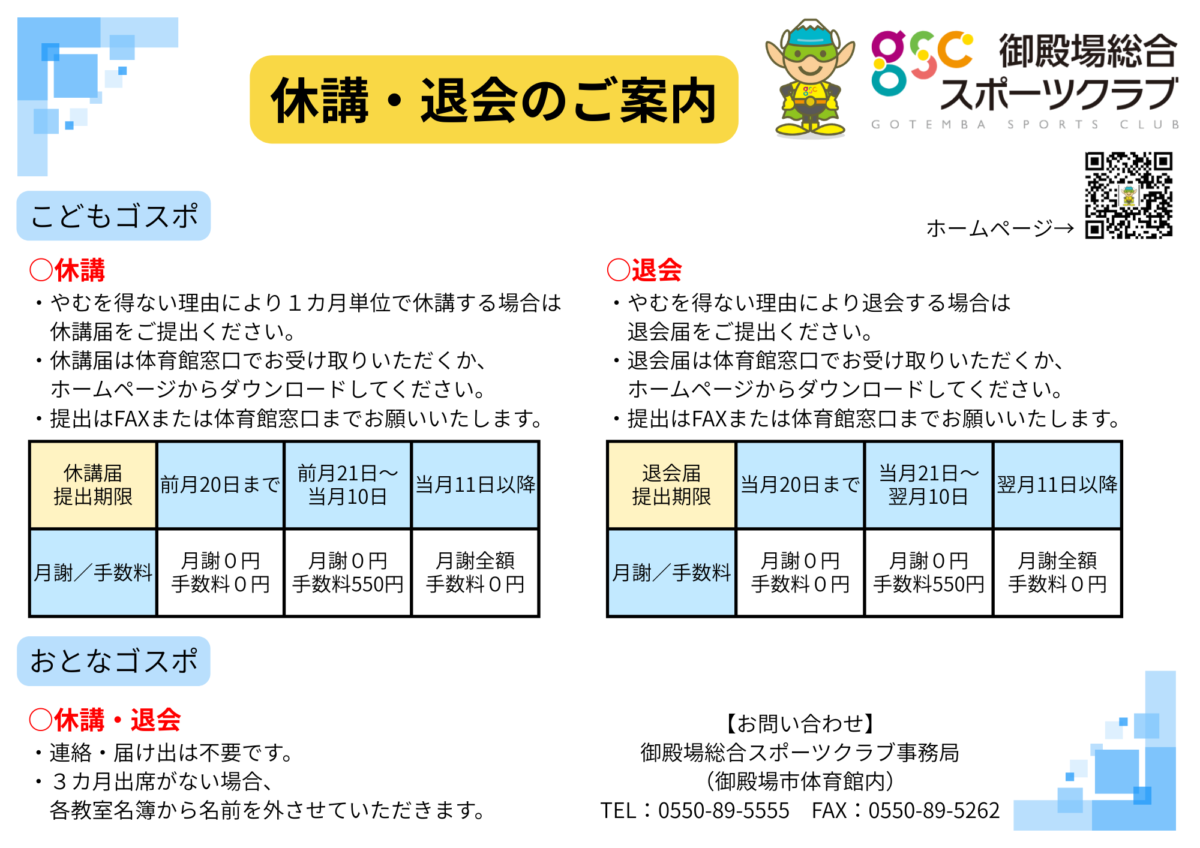 GSC放課後スポーツ教室の休講届は以下のPDFをダウンロード及び印刷してご記入後にFAX送信または窓口までご提出ください。
