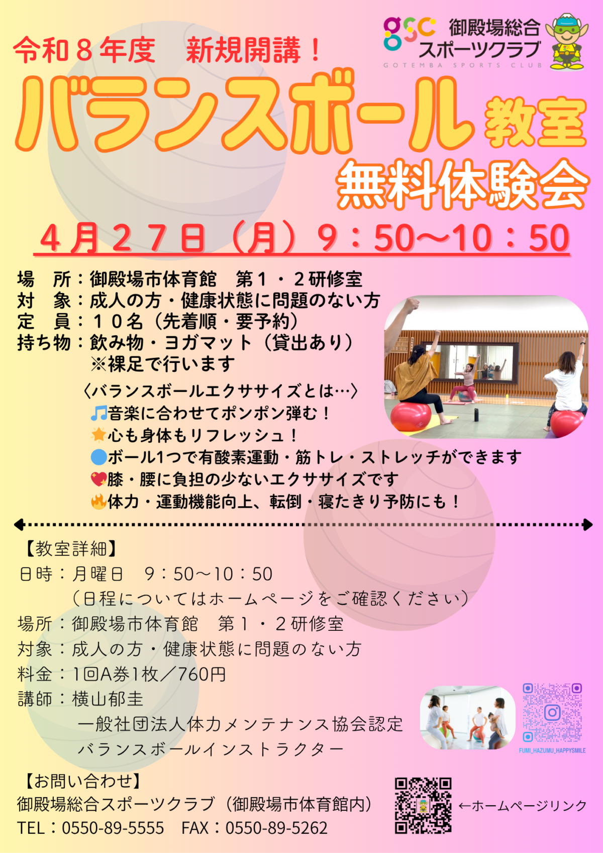 令和8年4月~【バランスボール】新規開講! Posted on 2026年3月9日2026年4月12日 初回4/27無料体験会開催します! バランスボール 教室ページ ※60歳以上の方も参加可能になりました!(健康状態に問題のない方)